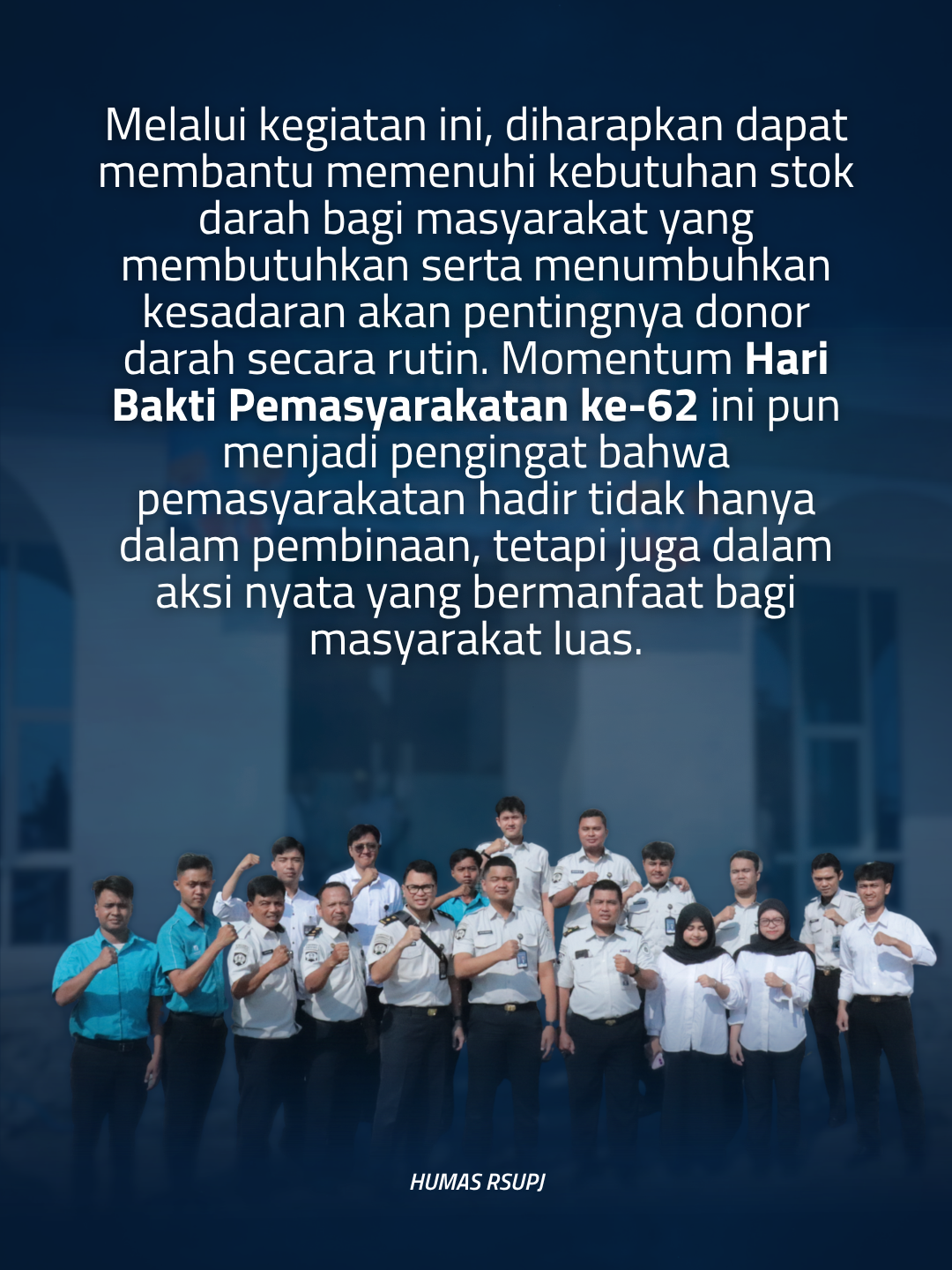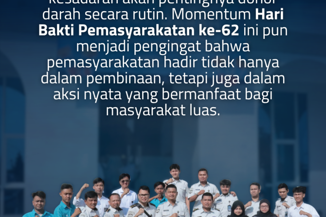 Melalui kegiatan ini, diharapkan dapat membantu memenuhi kebutuhan stok darah bagi masyarakat yang membutuhkan serta menumbuhkan kesadaran akan pentingnya donor darah secara rutin. Momentum Hari Bakti Pemasyarakatan ke-62 ini pun menjadi pengingat bahwa pemasyarakatan hadir tidak hanya dalam pembinaan, tetapi juga dalam aksi nyata yang bermanfaat bagi masyarakat luas.